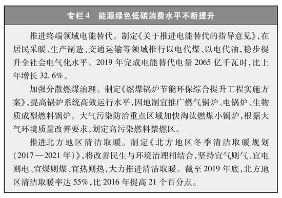 中国把推进能源绿色发展作为促进生态文明建设的重要举措,坚决打好污染防治攻坚战、打赢蓝天保卫战。煤炭清洁开采和利用水平大幅提升,采煤沉陷区治理、绿色矿山建设取得显著成效。落实修订后的《大气污染防治法》,加大燃煤和其他能源污染防治力度。推动国家大气污染防治重点区域内新建、改建、扩建用煤项目实施煤炭等量或减量替代。能源绿色发展显著推动空气质量改善,二氧化硫、氮氧化物和烟尘排放量大幅下降。能源绿色发展对碳排放强度下降起到重要作用,2019年碳排放强度比2005年下降48.1%,超过了2020年碳排放强度比2005年下降40%-45%的目标,扭转了二氧化碳排放快速增长的局面。