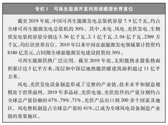 持续推进能源科技创新,能源技术水平不断提高,技术进步成为推动能源发展动力变革的基本力量。建立完备的水电、核电、风电、太阳能(6.650, -0.05, -0.75%)发电等清洁能源装备制造产业链,成功研发制造全球最大单机容量100万千瓦水电机组,具备最大单机容量达10兆瓦的全系列风电机组制造能力,不断刷新光伏电池转换效率世界纪录。建成若干应用先进三代技术的核电站,新一代核电、小型堆等多项核能利用技术取得明显突破。油气勘探开发技术能力持续提高,低渗原油及稠油高效开发、新一代复合化学驱等技术世界领先,页岩油气勘探开发技术和装备水平大幅提升,天然气水合物试采取得成功。发展煤炭绿色高效智能开采技术,大型煤矿采煤机械化程度达98%,掌握煤制油气产业化技术。建成规模最大、安全可靠、全球领先的电网,供电可靠性位居世界前列。“互联网+”智慧能源、储能、区块链、综合能源服务等一大批能源新技术、新模式、新业态正在蓬勃兴起。