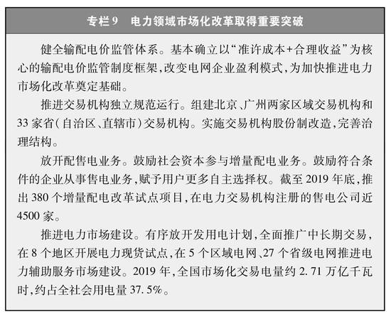 全面提升能源领域市场化水平,营商环境不断优化,市场活力明显增强,市场主体和人民群众办事创业更加便利。进一步放宽能源领域外资市场准入,民间投资持续壮大,投资主体更加多元。发用电计划有序放开、交易机构独立规范运行、电力市场建设深入推进。加快推进油气勘查开采市场放开与矿业权流转、管网运营机制改革、原油进口动态管理等改革,完善油气交易中心建设。推进能源价格市场化,进一步放开竞争性环节价格,初步建立电力、油气网络环节科学定价制度。协同推进能源改革和法治建设,能源法律体系不断完善。覆盖战略、规划、政策、标准、监管、服务的能源治理机制基本形成。